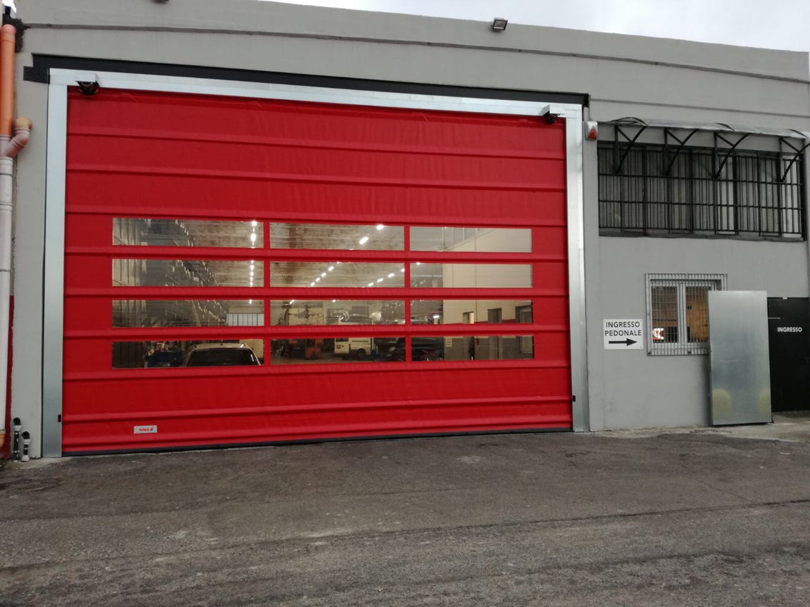 PACK door is a fold up door composed by perimeter self-supporting frame in galvanized steel and a PVC curtain reinforced with horizontal steel bars to assure a wind resistance up to 160 Km/h. Curtain is lifted by strong belts and collected on top.