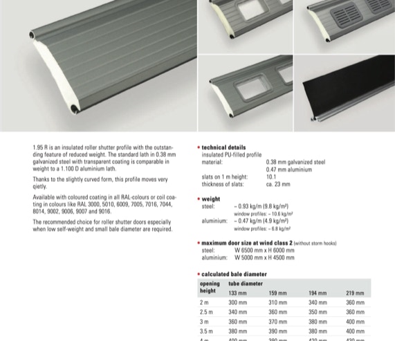 The Sprint Secure Door has a 1.95 R is an insulated roller shutter profile with the outstanding feature of reduced weight. The standard lath in 0.38 mm galvanised steel with transparent coating is comparable in weight to a 1.100 D aluminium lath